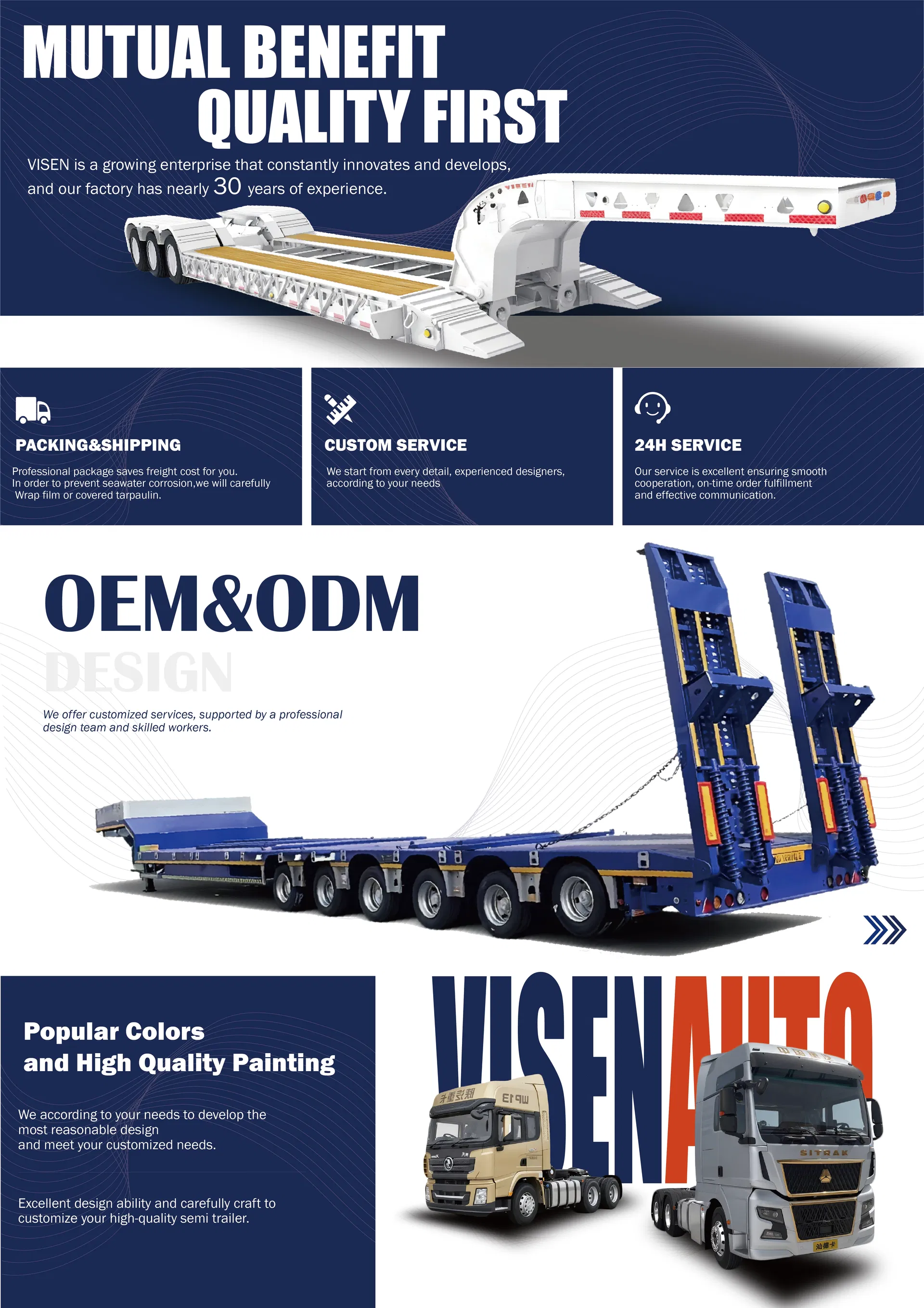 We are a professional industry-trade integrated enterprise, specializing in semi-trailer manufacturing as well as engineering vehicle export. With an annual export volume of over 1,000 units, we offer a full range of special-purpose vehicle customization. Our 180,000-square-meter facility ensures quality through strict multi-level inspection and guarantees efficiency with rapid order response.